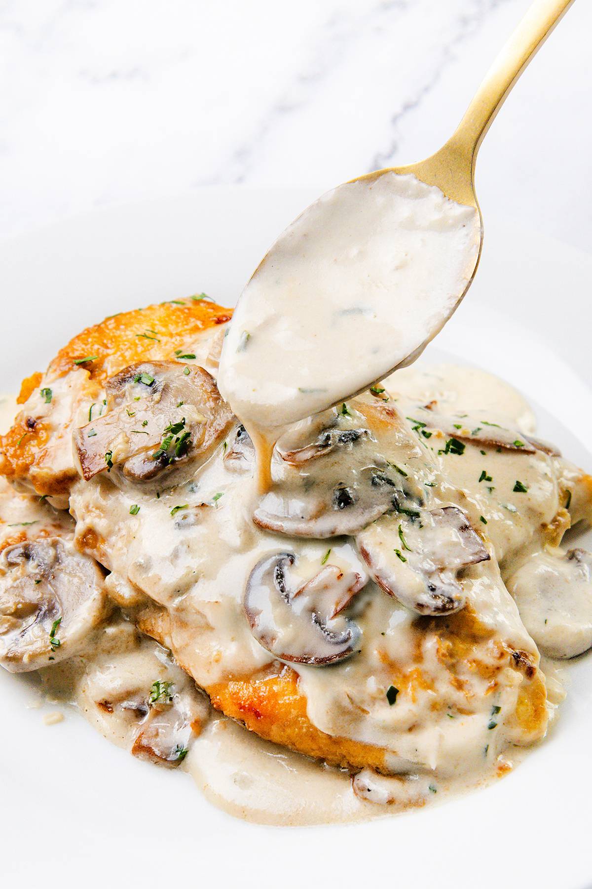 Creamy Mushroom Chicken is juicy, golden pan-fried chicken smothered in a rich garlic mushroom cream sauce with parmesan and white wine. So cozy, comforting, and totally dinner-party-worthy.
