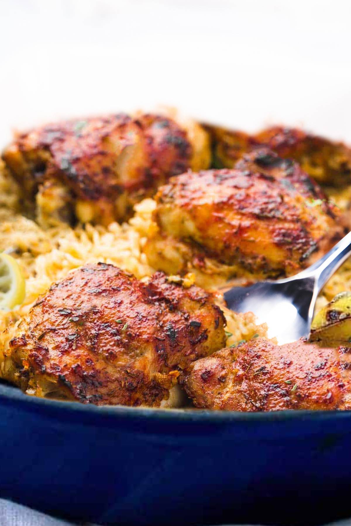 Lemony garlic rice and juicy chicken thighs baked together in the same pan, creating an easy and flavorful weeknight dinner.
