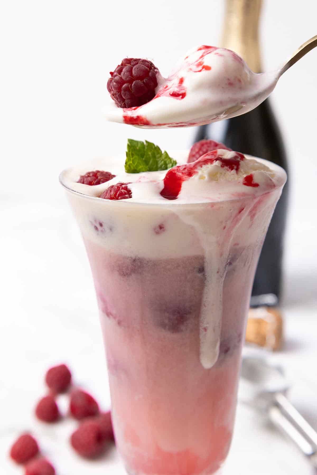These Sparkling Champagne Floats blend creamy vanilla ice cream with bright, tart raspberry syrup and fizzy champagne for a refreshing, fruity, and lightly sweet dessert drink.